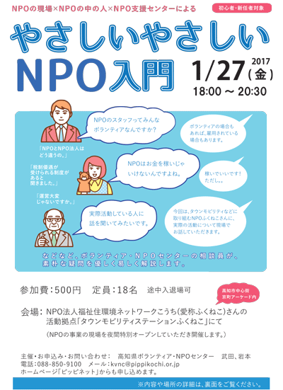 NPO活動初心者の方や、NPO新任者、理事になられたけれどもNPOのことをあまり知らない。。などの方々を対象に、NPOについての基礎的なことを、リラックスして学んでいただく講座です。