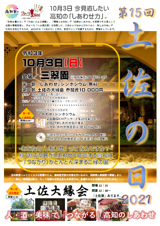 第一部「しあわせ」シンポジウムは入場が無料で、2021年のしあわせ指標の発表をその場で行う予定にしておりますので、皆様のご参加をお待ちしております。
