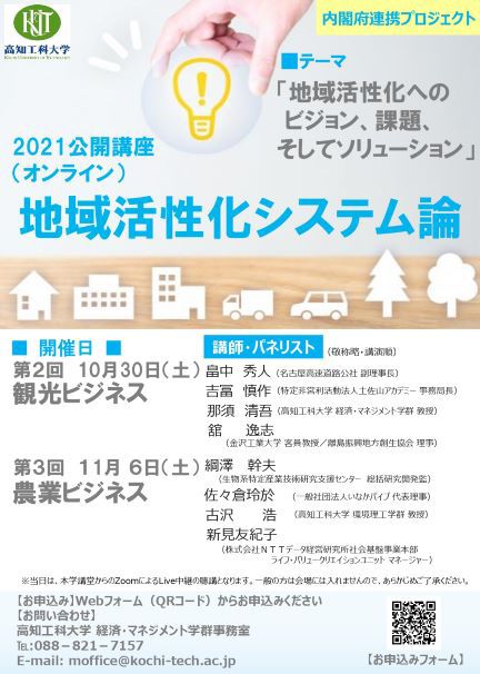 「地域活性化システム論」では、内閣府と連携して、各省庁の地域活性化政策担 当者、全国の地域活性化事業にかかわるリーダー、有識者、高知工科大学経済・マネジ メント学群の教員等の講師が、講演、パネル討議を通して実践的な人材養成を推進します。