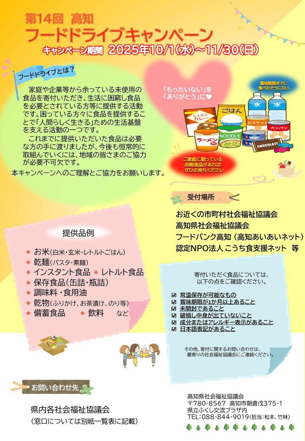 高知県社会福祉協議会では、フードバンク高知(高知あいあいネット)と、NPO法人こうち食支援ネットと共催し、「フードドライブキャンペーン」を、10月1日(水)~11月30日(日)まで開催いたします。