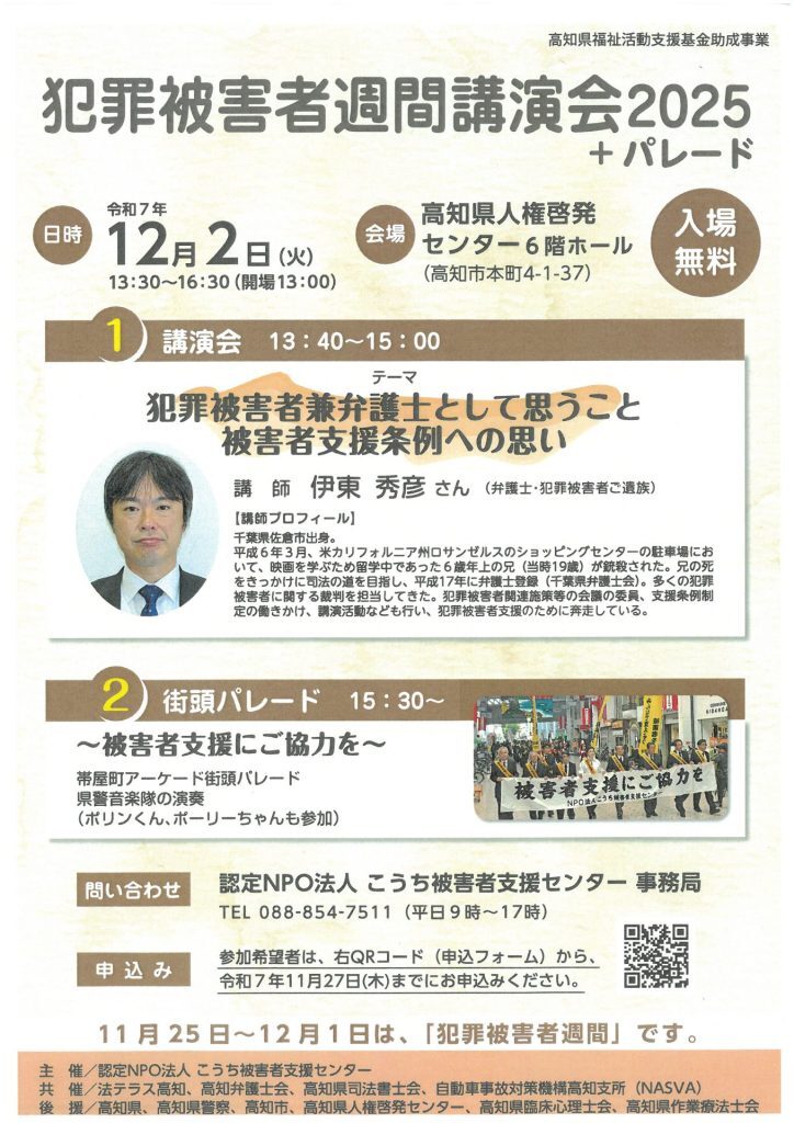 認定NPO法人こうち被害者支援センターでは犯罪被害者週間にあわせて「犯罪被害者週間講演会2025+パレード」を開催いたします。