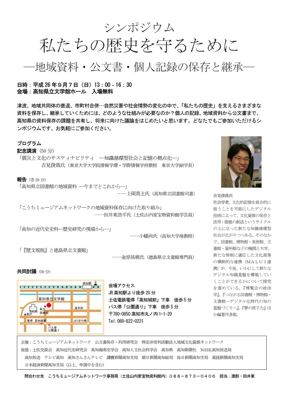 津波、地域共同体の衰退、市町村合併 自然災害や社会情勢の変化の中で、「私たちの歴史」を支えるさまざまな資料を保存し、継承していくためには、どのような仕組みが必要なのか?個人の記録、地域資料から公文書まで、高知県の資料保存の課題を共有し、将来に向けた議論をはじめたいと思います。どなたでもご参加いただけるシンポジウムです。お気軽にご参加ください。